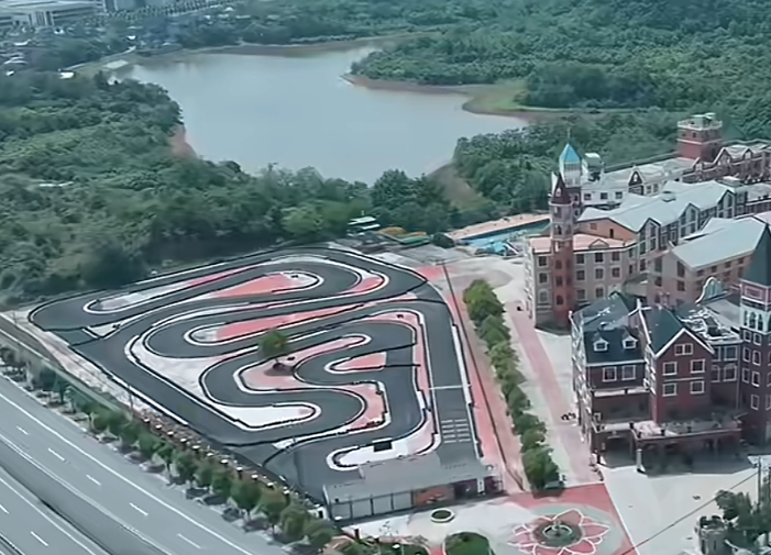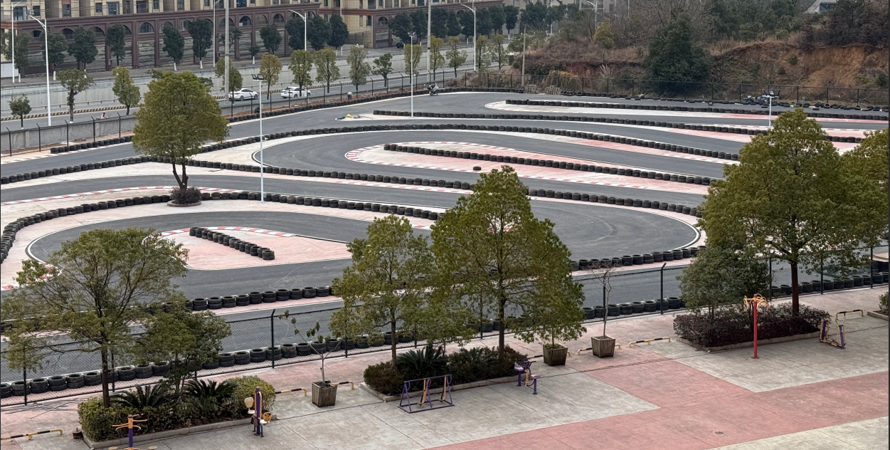 The actual photos demonstrate the completed construction of the track. From an aerial view, the track layout is almost identical to the design rendering, proving the construction team's precise execution of the design details. The black and red track surface stands out prominently in reality, creating a striking contrast with the surrounding buildings and natural landscape, providing an excellent visual experience for both go-kart drivers and spectators.